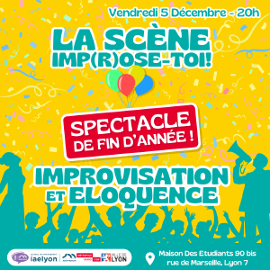 La Scène Imp(r)ose toi est un spectacle gratuit composée, en première partie, de plusieurs discours d'éloquence écrits et récités par nos adhérents puis en seconde partie d'un cabaret d'improvisation dirigé par un arbitre !